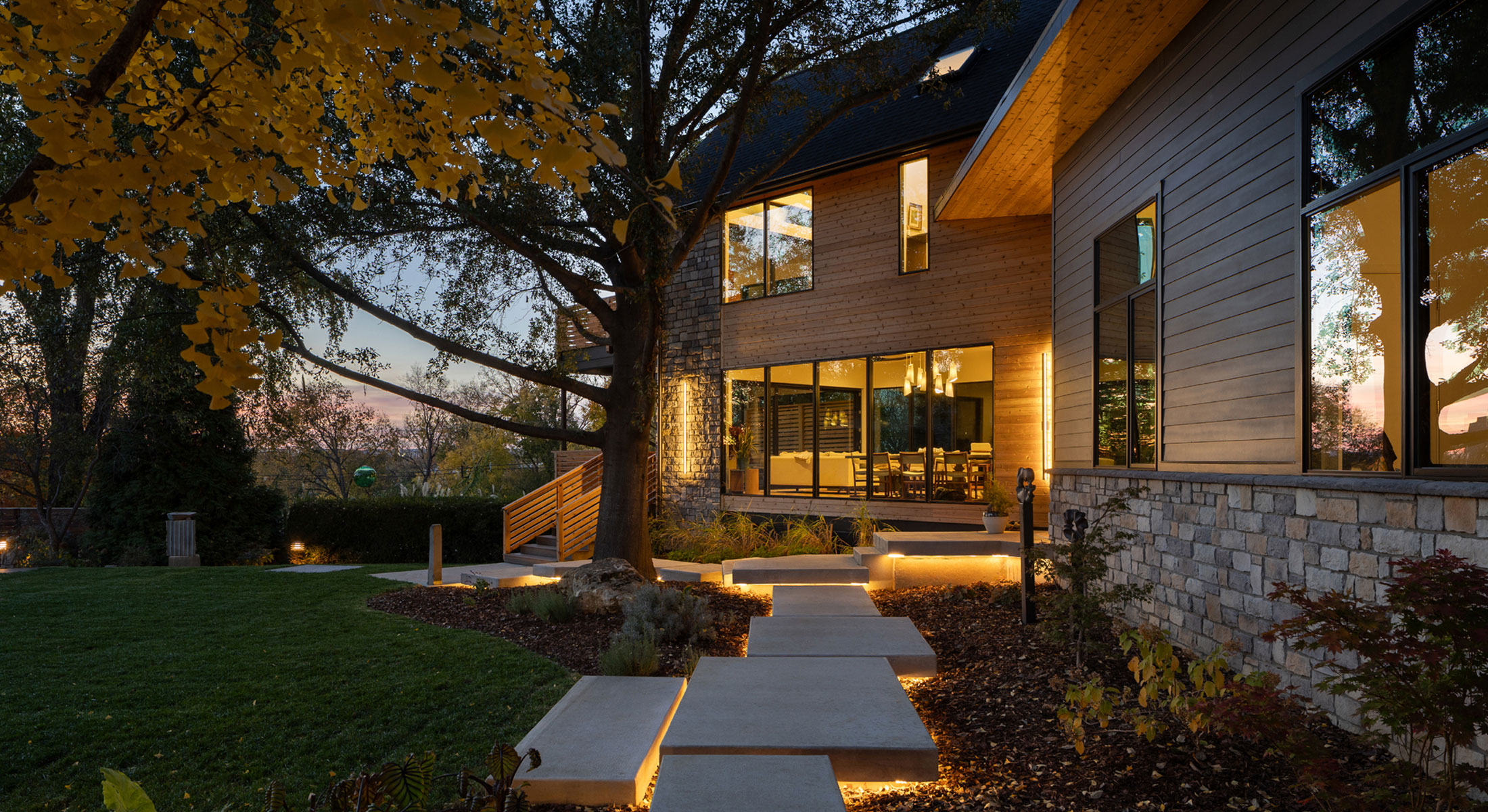 This new home is carefully situated within Louisville’s historic Irish Hill neighborhood and was positioned to capture views of the downtown skyline. The owners had requested a modern, functional home for their blended family, utilizing a clean style, natural materials, and Japanese site design elements. The floor plan wraps around an existing mature White Oak tree, and the bend provides separation between the children’s bedrooms and the shared living and kitchen areas. The primary suite on the second floor provides valued privacy and stunning views among the trees and to the city beyond.